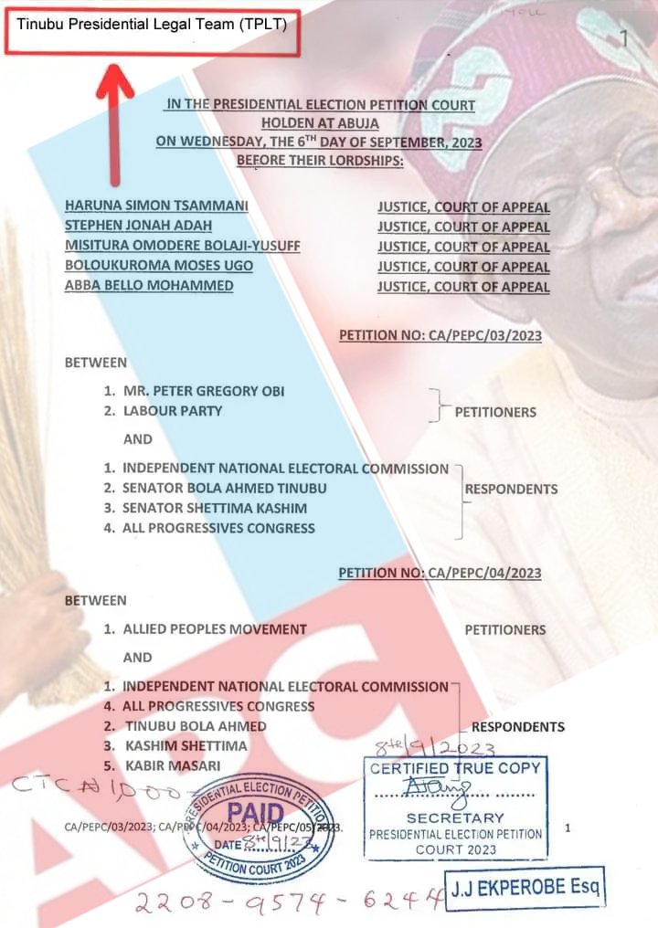 The Labour Party (LP) has called on the Presidential Election Petition Court (PEPC) and the All Progressives Congress (APC), to explain to Nigerians the circumstances concerning the inclusion of the APC watermark on the certified true copies (CTC) of the PEPC judgement on the petition filed by its candidate against Bola Tinubu’s election.