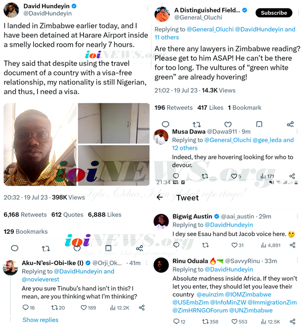 Frontline investigative journalist and treasure of Nigerians worldwide, Mr David Hundeyin, threw Nigerians into panic mode as tweets from his verified twitter handle (@DavidHundeyin), at around 20.32pm GMT late night wednessday 19th, began to reveal he was under detention for the past 7 hours in a Zimbabwean airpot holding room